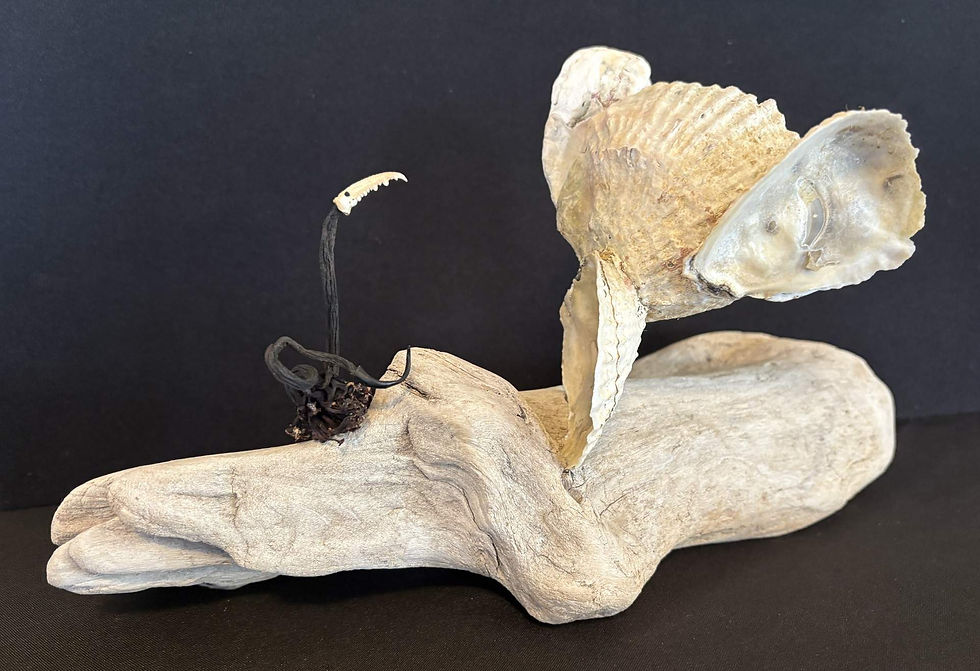 His art career began in 2023 from an inner urge to create something from found seashore objects brought in or turned up by the rhythm of the tides.